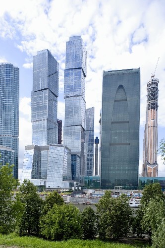 Вид через Москва-реку. Слева-направо: “Башня на Набережной”; “Город Столиц” (башни “Санкт-Петербург”, “Москва”); комплекс “Башня Федерация” (tower “Запад”); башня “Империя”; “Меркурий Сити”