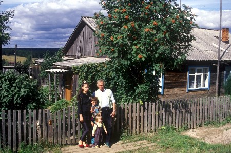 D’iakonov family in front of their side of 2-family wooden dwelling. From left: Tat’iana, Vladislav, Egor, Gennadii Petrovich D’iakonov