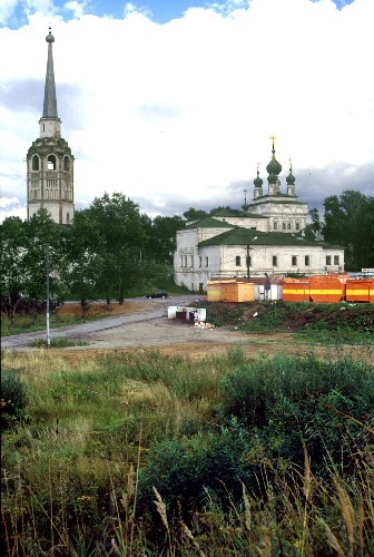 Market square; left: cathedral bell tower; center: church of the Resurrection; right: cathedral of Trinity