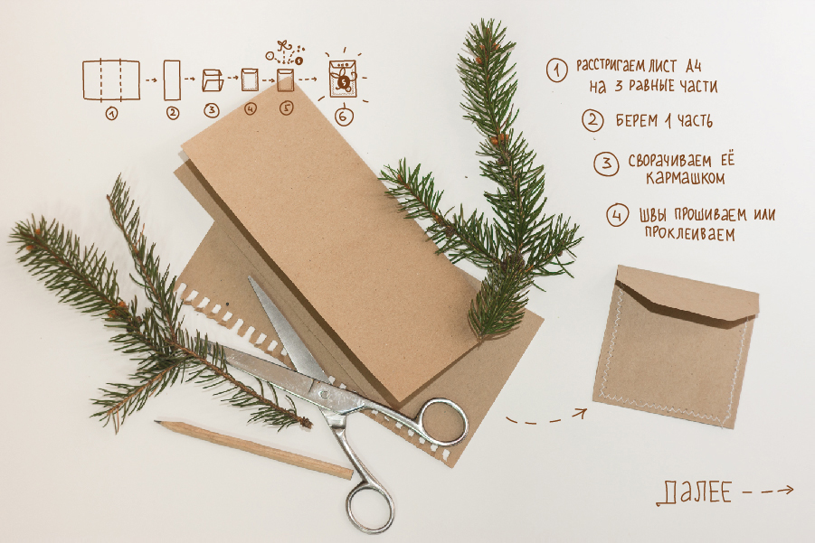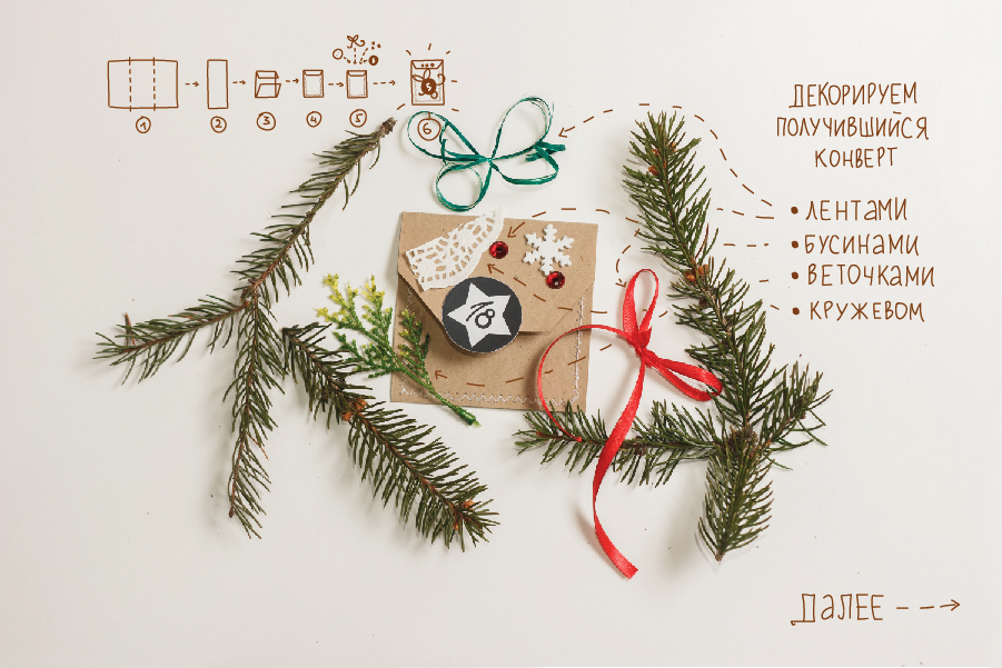 Мы предлагаем вам сделать адвент-календарь из бумаги в виде оригинальных открыток-конвертиков. Для работы вам потребуется: крафтовая бумага, ажурная салфетка, атласная лента, рафия, искусственные веточки, бусины и теги с номерами. Всё это можно приобрести в магазине для рукоделия, а при желании – заменить любыми подручными материалами. Конвертики могут быть как традиционной прямоугольной формы, так и в форме звезд, варежек, новогодних шаров, валенок. Декорировать их можно любым способом, дав волю фантазии. Подробная пошаговая инструкция – на фото ниже. Сделайте праздником ожидание праздника!