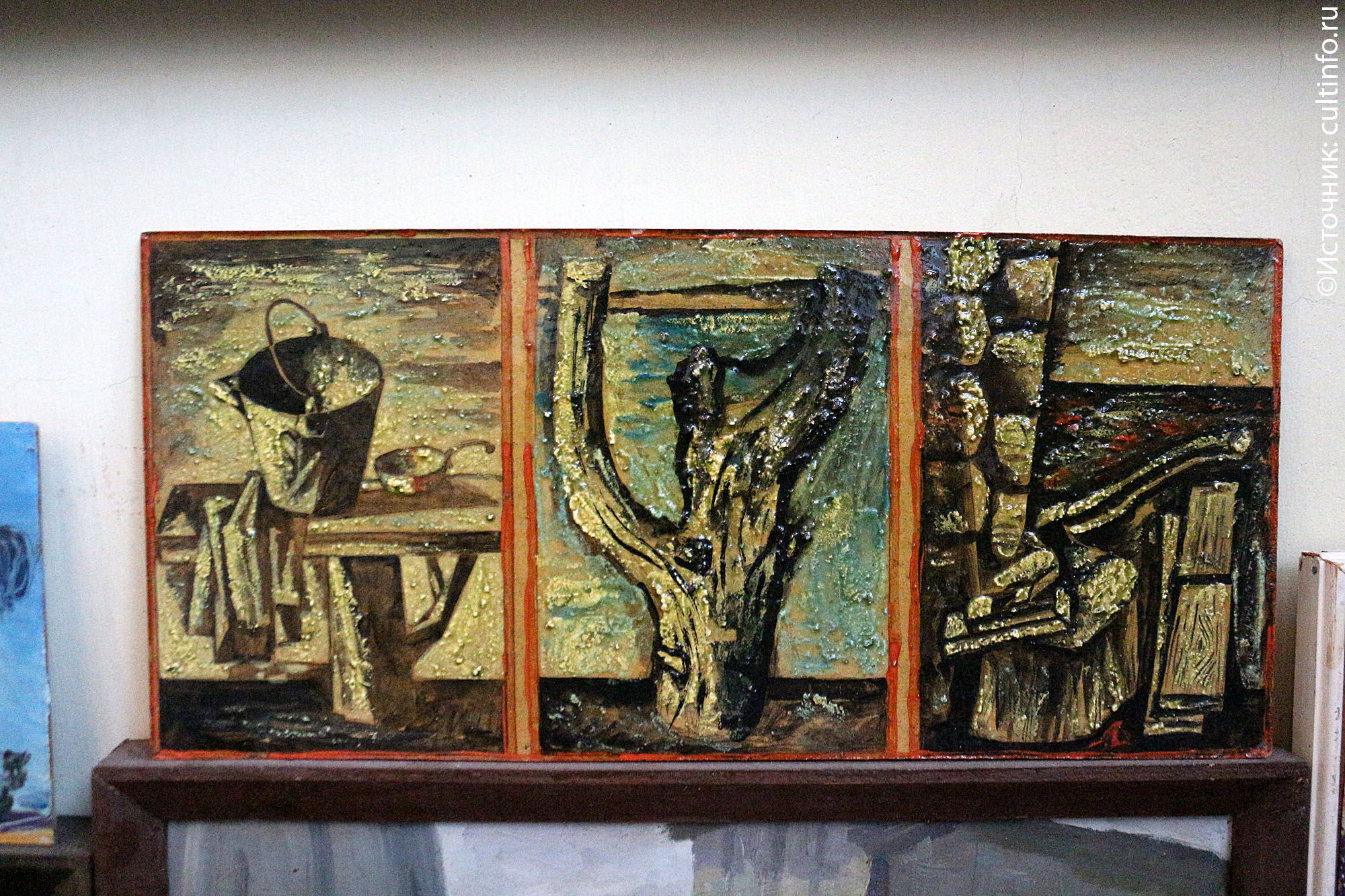 Мольберт с почти оконченной работой, закапанные краской табуретки и стулья, антресоль из «родной кубенской березы», сделанная самим художником для подхода к окну мансарды, откуда открывается потрясающий вид на реку Вологду, – и, конечно, множество картин, некоторые из которых не видел никто, кроме самого художника. Картины ждут своего часа, большой выставки, где они смогут в полной мере представить особенность художественного мира Генриха Асафова.