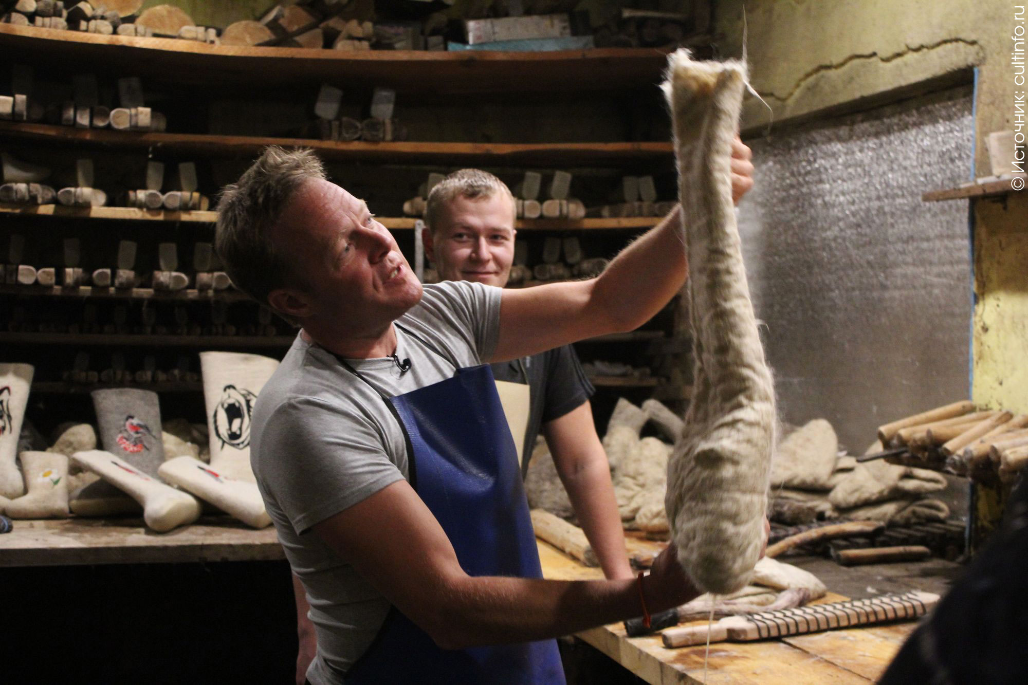 Из мастерской Егора Сайкина ведущий НТВ увез подарок – готовый комплект валенок с логотипом передачи «Поедем, поедим!».