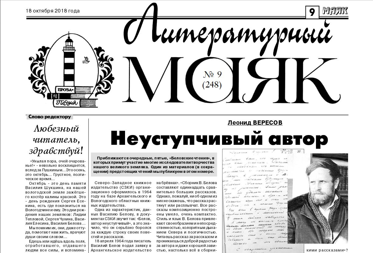 В преддверии «Беловских чтений», которые стартуют на Вологодчине 22 октября, номер открывает литературное исследование Леонида Вересова, историка литературы из Череповца. В нем рассказывается об отношениях Василия Белова и Северо-Западного книжного издательства, которые порой складывались непросто.