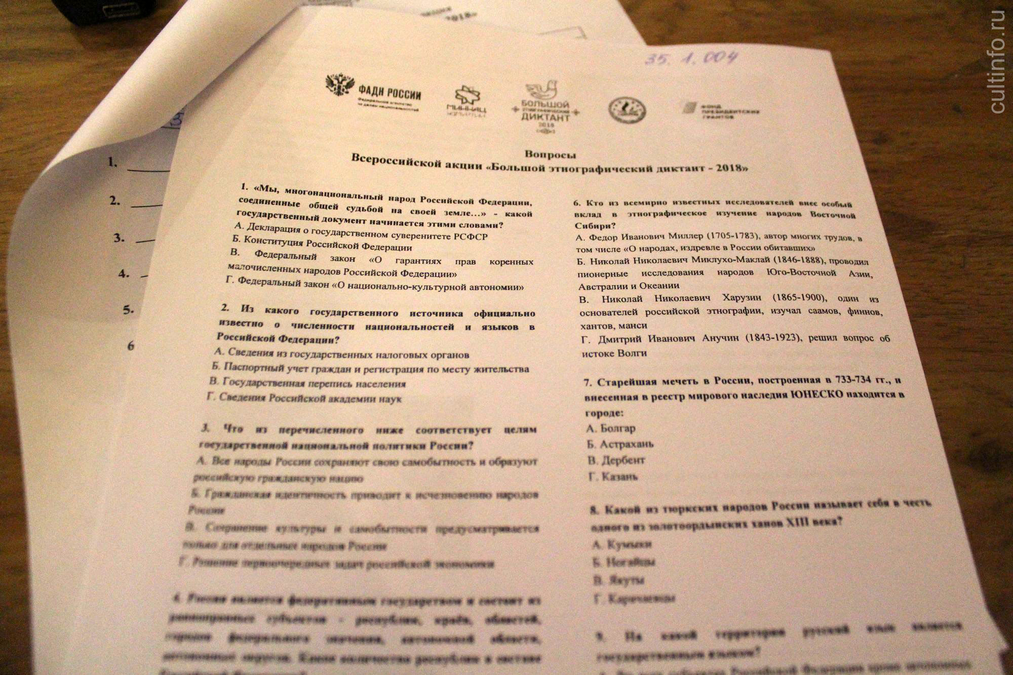 Всероссийская акция под названием «Большой этнографический диктант» посвящена привлечению внимания к вопросам языков, культур, традиций народов, проживающих на территории России. «Народов много – страна одна» – лозунг Большого этнографического диктанта. Акция проводилась уже в третий раз и в этом году приобрела международный характер – свои знания по этнографии, помимо россиян, могли проверить жители Киргизии, Молдовы, Таджикистана и других государств. Вопросы теста ранжировались: 20 из них касались знаний истории и культуры России в целом, 10 были связаны с традициями региона, в котором проводился диктант.