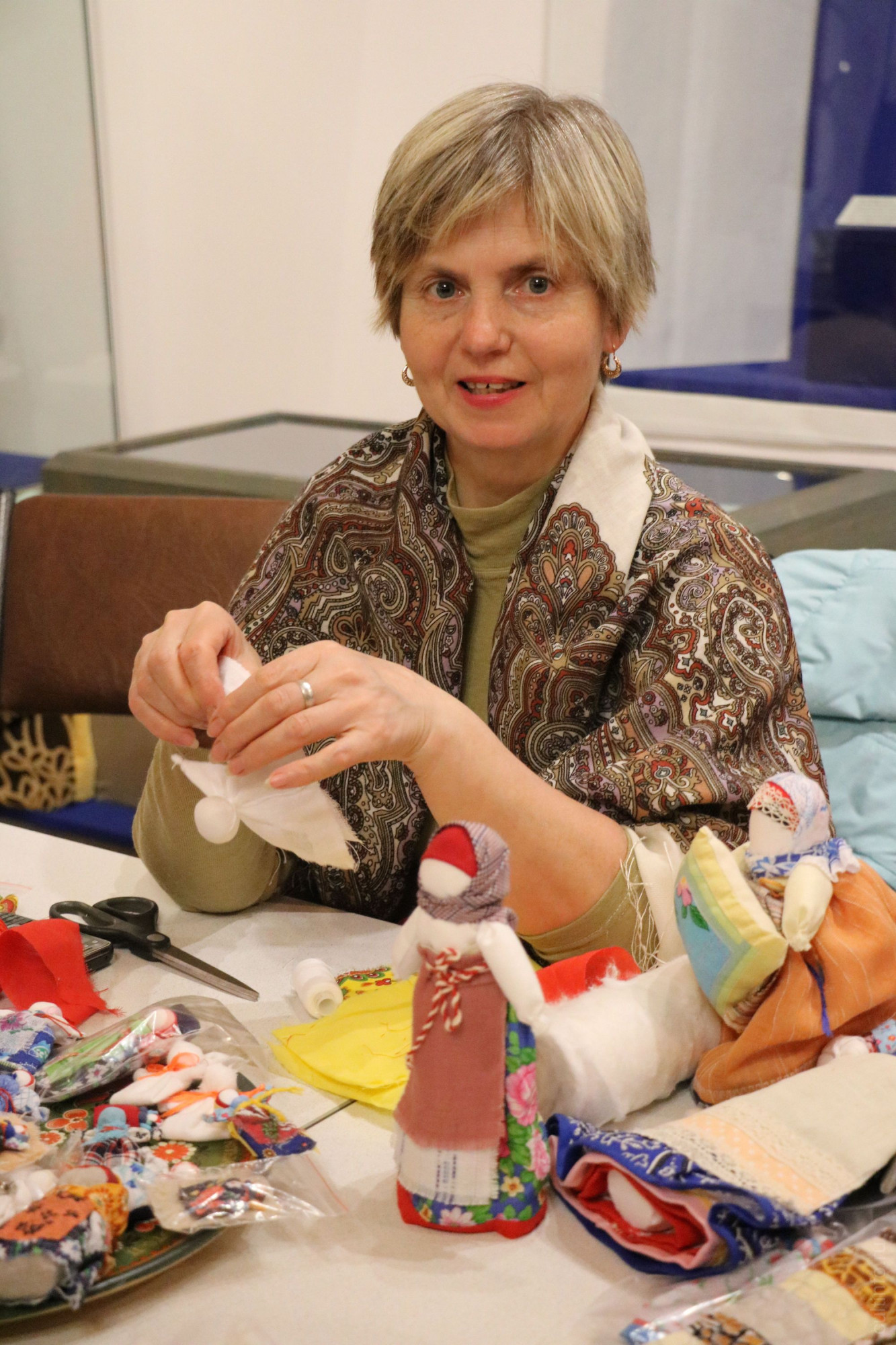 На втором этаже трудились мастера и их ученики: они создавали куклы-обереги, рисовали эскизы, практиковались в росписях. На фоне постоянной экспозиции народного искусства музей «Семёнково» представил театрализованную программу.