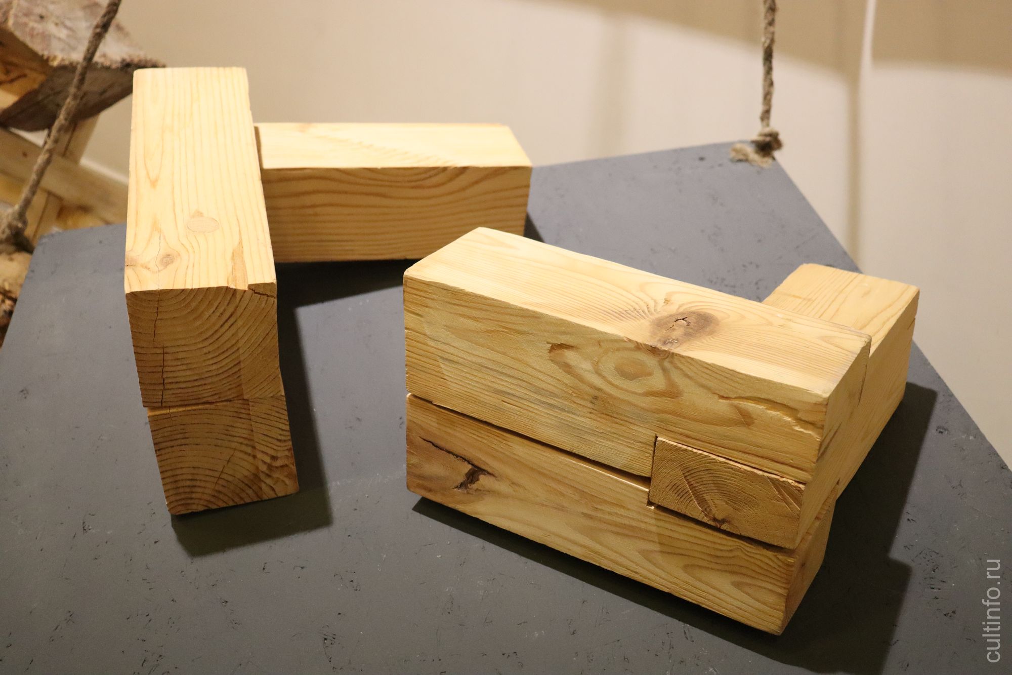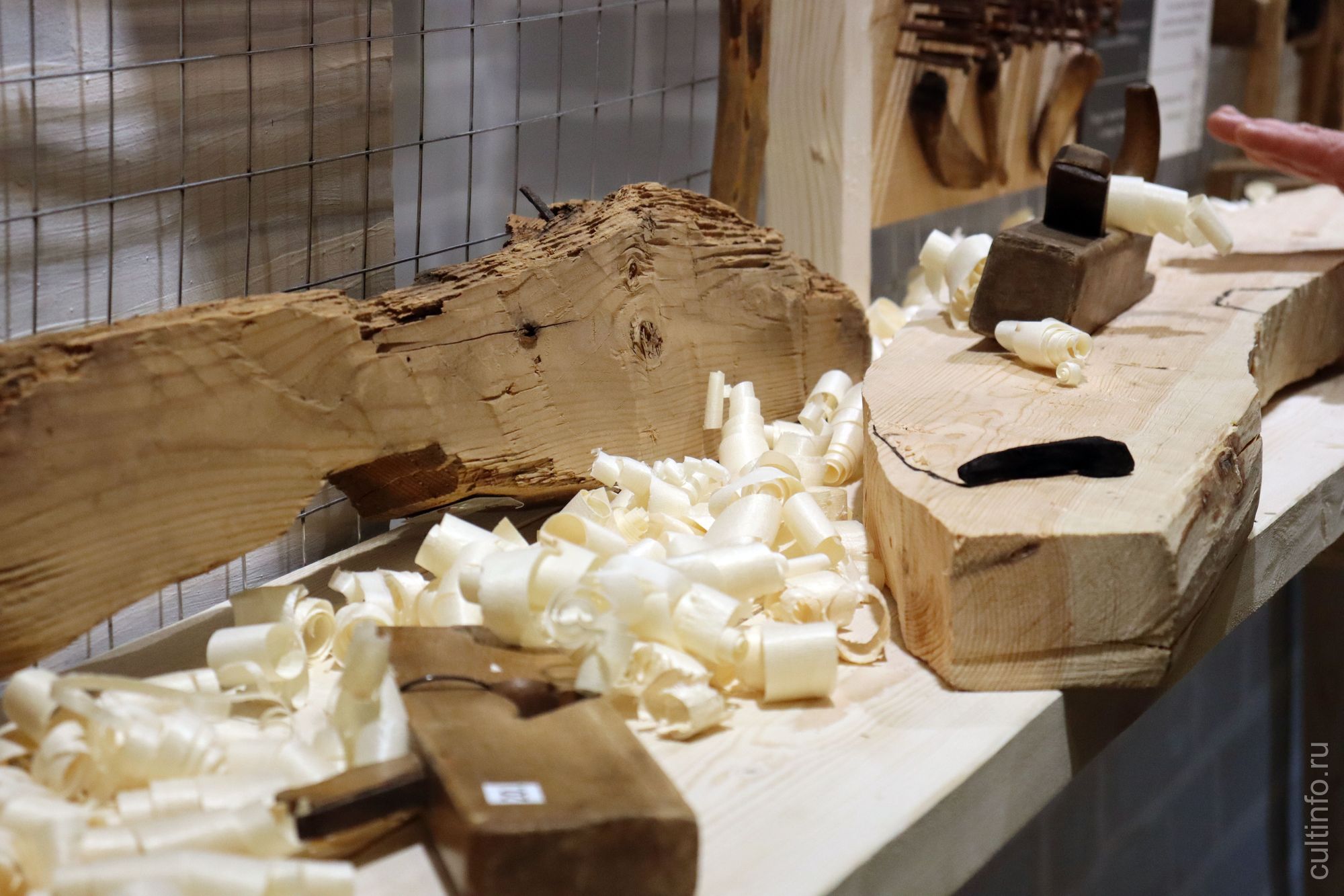На выставке воссоздана импровизированная мастерская, где можно увидеть плотницкие и столярные инструменты. Среди них и знаменитый «кондачок», позволяющий легко переворачивать бревна.
