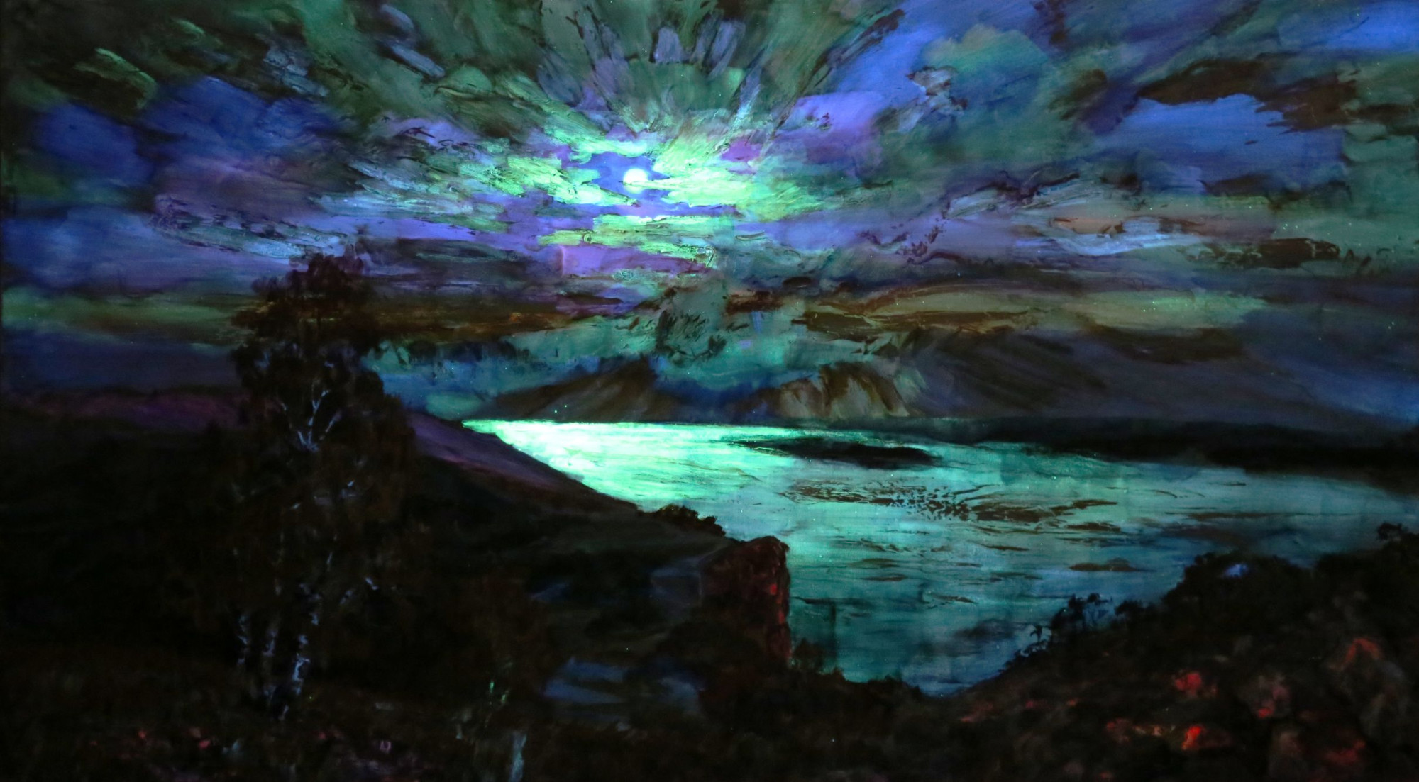 Отдельным блоком можно выделить работы, светящиеся в темноте. Они рассчитаны на разное освещение, и, по задумке автора, при погашенном свете работа выглядит по-другому. Идея светящегося образа, созданного с помощью частиц-люминофоров, способных накапливать свет и в темноте излучать его – оригинальное решение художника, в котором обретаются новые смыслы.