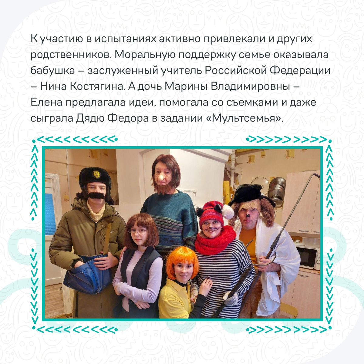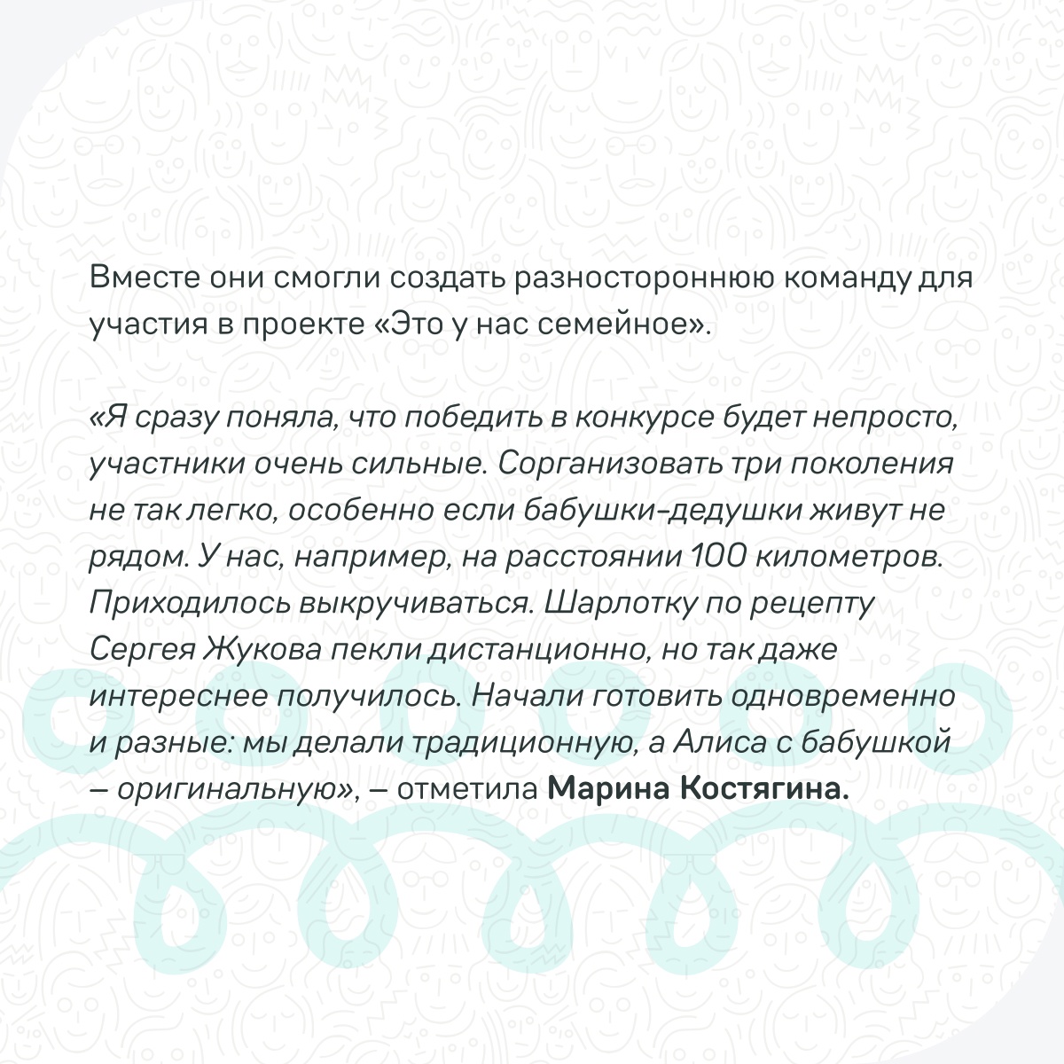 Истории конкурсантов публикуются в группе проекта vk.com/public216538617, например, здесь можно прочитать о семье Алферьевых-Костягиных-Славновых из Вологодской области, которые прошли в полуфинал.