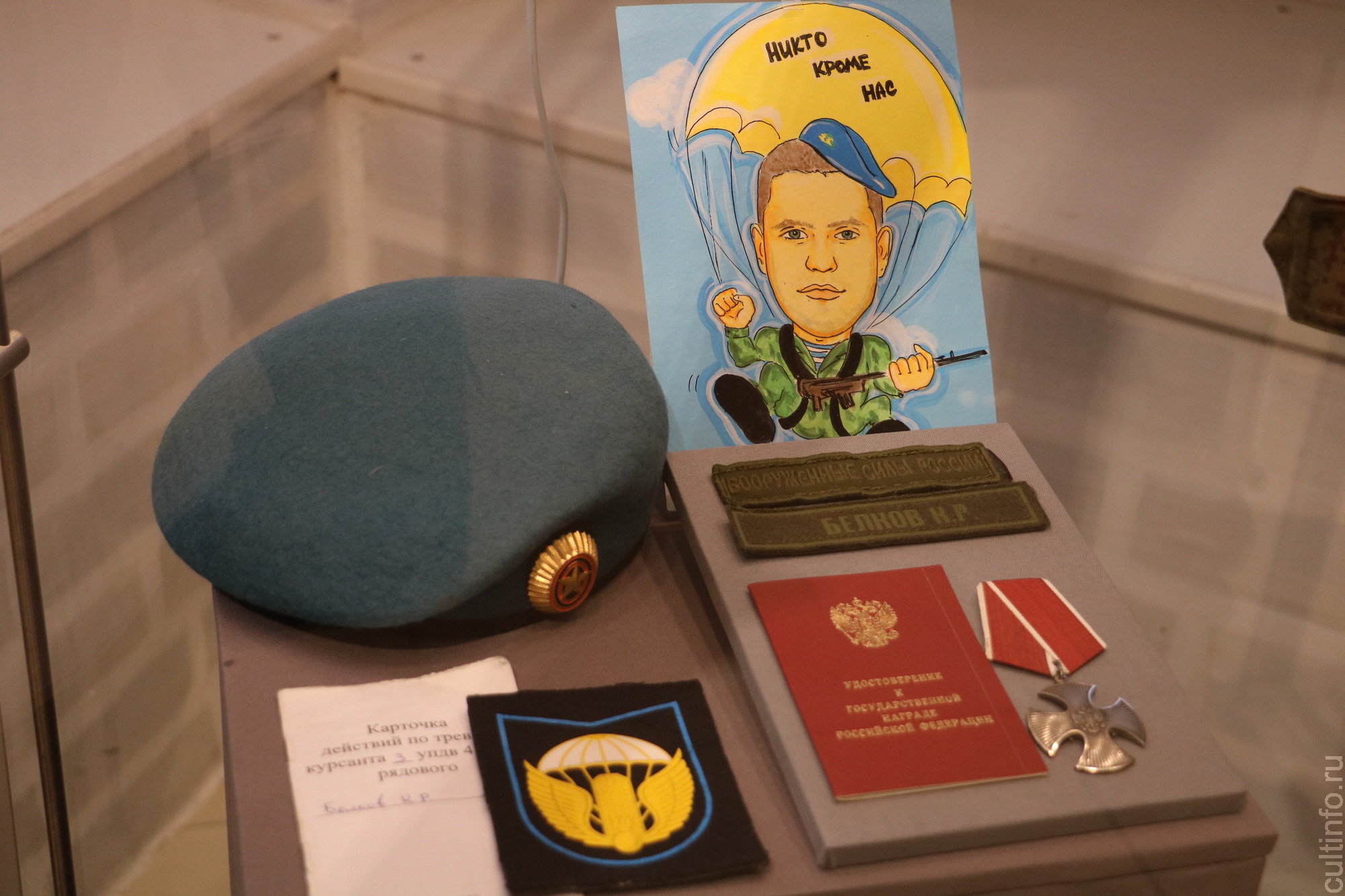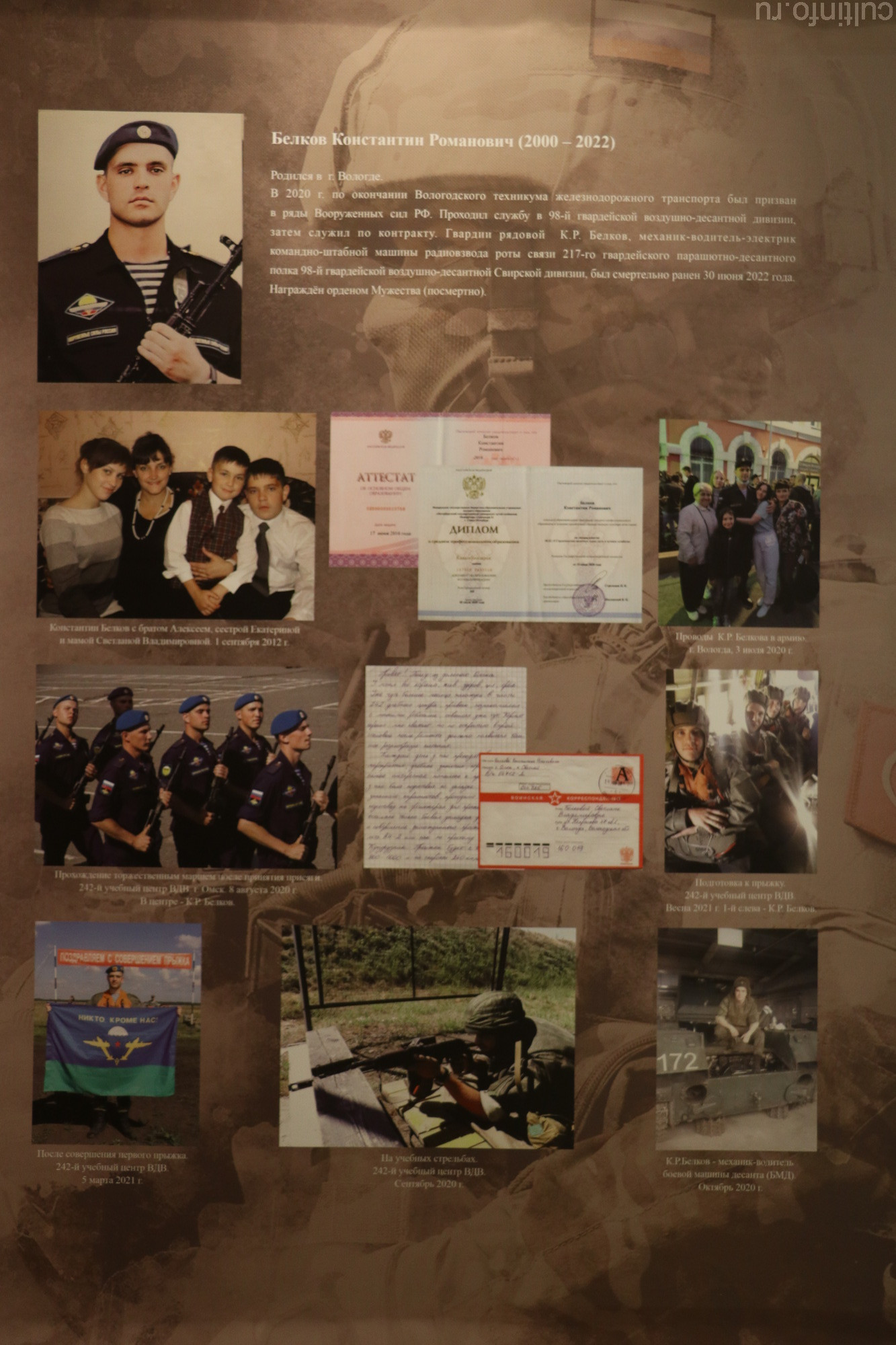 Среди вещей Константина Белкова – аттестат, письмо из армии. После службы он остался по контракту, и оставался буквально месяц до возвращения домой, где его ждали – уже готовили целый праздник с сюрпризами. Одним из сюрпризов была специальная открытка с его портретом. Но в июне 2022 года связь с ним оборвалась, а потом родные узнали, что он погиб. Теперь эта открытка стала экспонатом выставки…