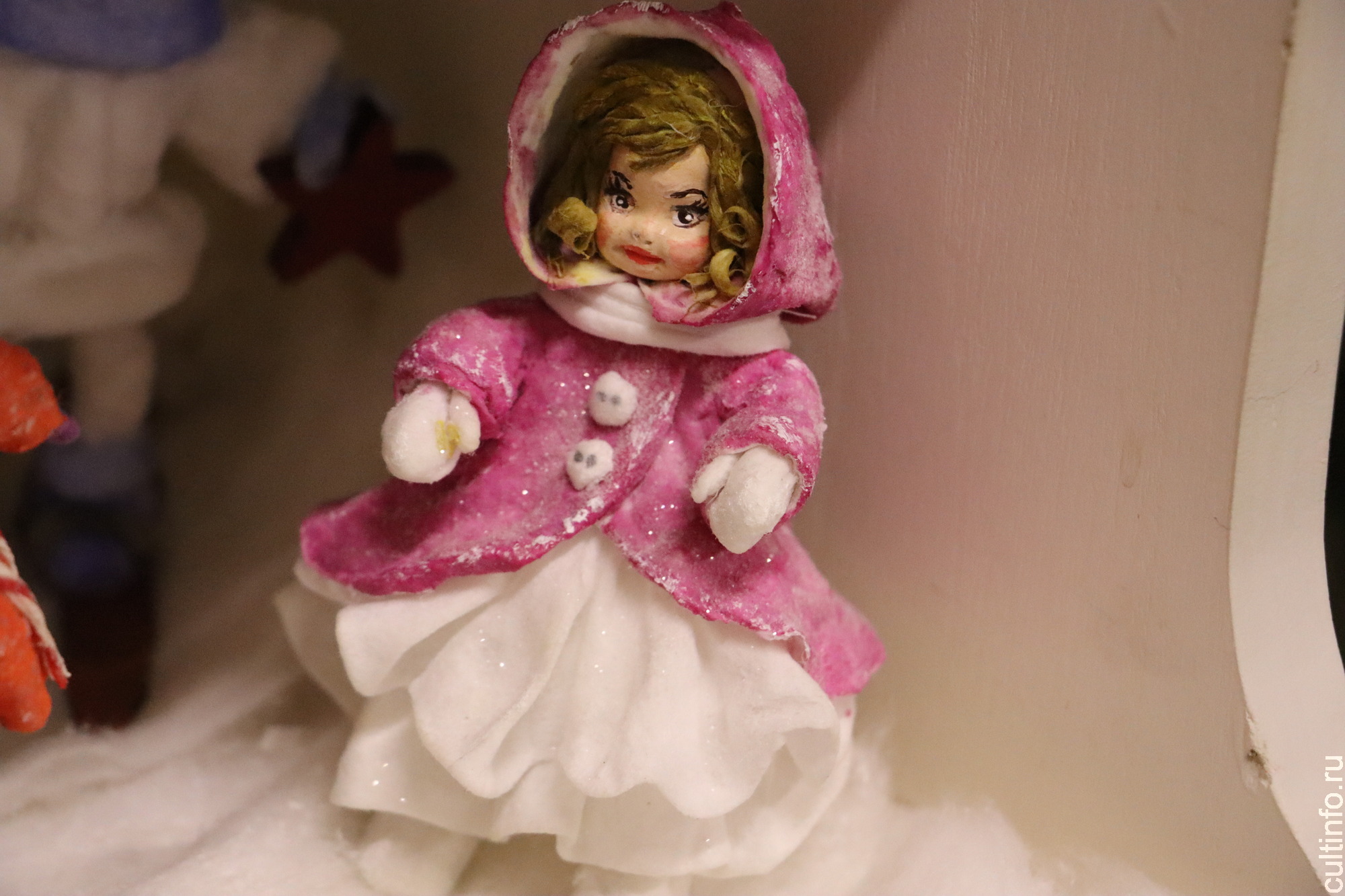 На выставке в «Резном палисаде» представлены ватные игрушки различной тематики. Это персонажи любимых книг, например девочка из сказки «12 месяцев», или птица Сирин из легенд. Можно увидеть и космонавтов, и пограничников, и жителей северных широт, и разных животных и птиц – от белых медведей и полярных сов до слонов и жирафов. Есть и тематические композиции, например «Масленица» – со скоморохами, ряжеными и барышнями с блинами. И конечно, на выставке присутствуют новогодние и рождественские персонажи – Дед Мороз, Снегурочка, ангелы, дети в зимних тулупах на лыжах, с санками и снеговиками, в карнавальных костюмах.