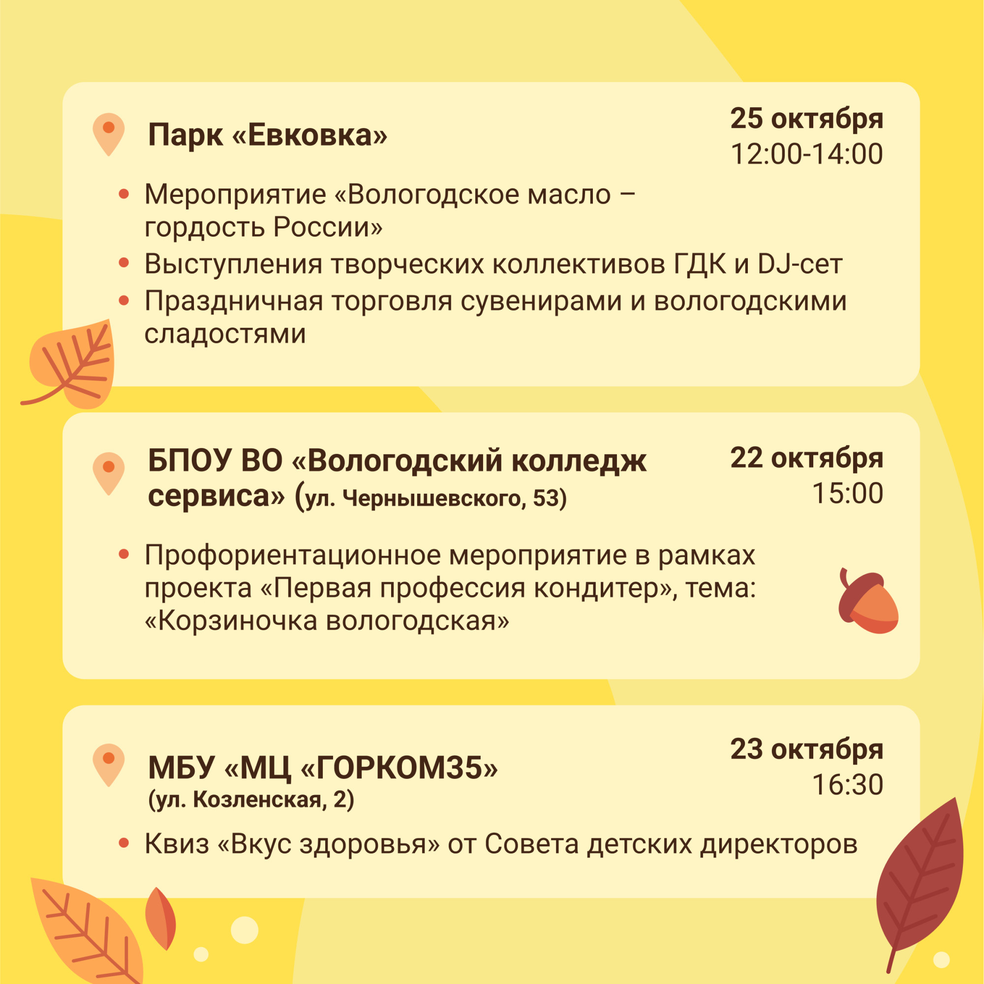 Для школ и детских садов тоже на следующей неделе будет разработано специальное праздничное меню с использованием масла. Кроме того, 23 октября в МЦ «Горком35» пройдет квиз для школьников «Вкус здоровья», посвященный теме здорового питания, истории вологодского масла и свойствам этого полезного и натурального продукта.