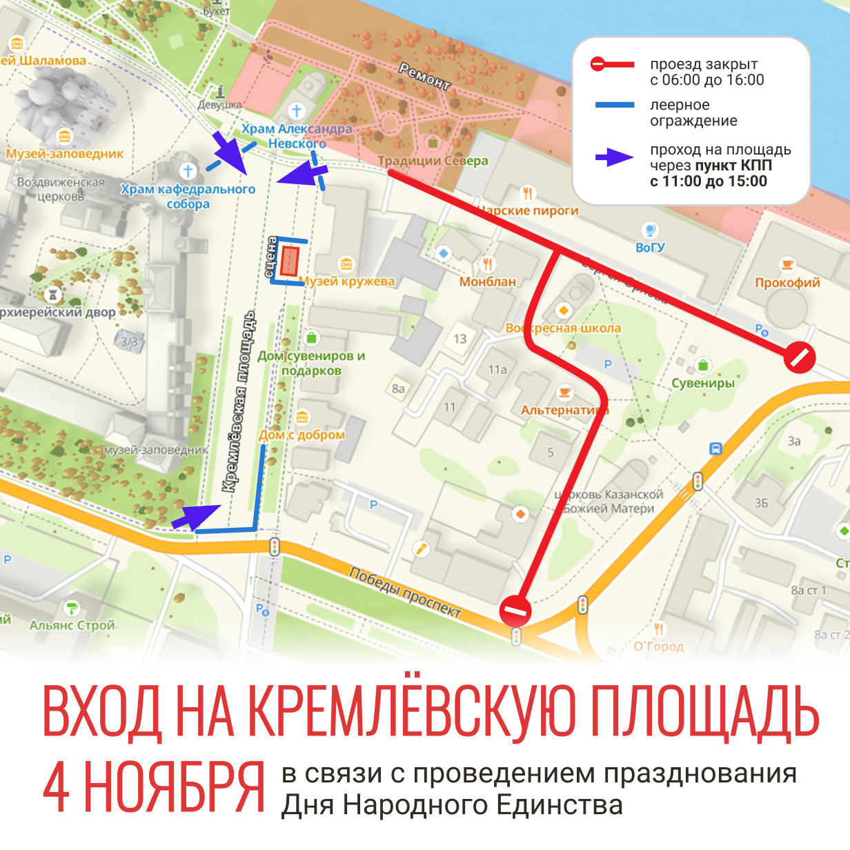 В целях обеспечения безопасности вход на Кремлевскую площадь будет организован через КПП. Всего планируется развернуть три контрольно-пропускных пункта: в районе перекрестка проспекта Победы и улицы Батюшкова, у Воскресенского собора и у Музея кружева. КПП будут работать во время проведения мероприятия с 11:00 до 15:00.