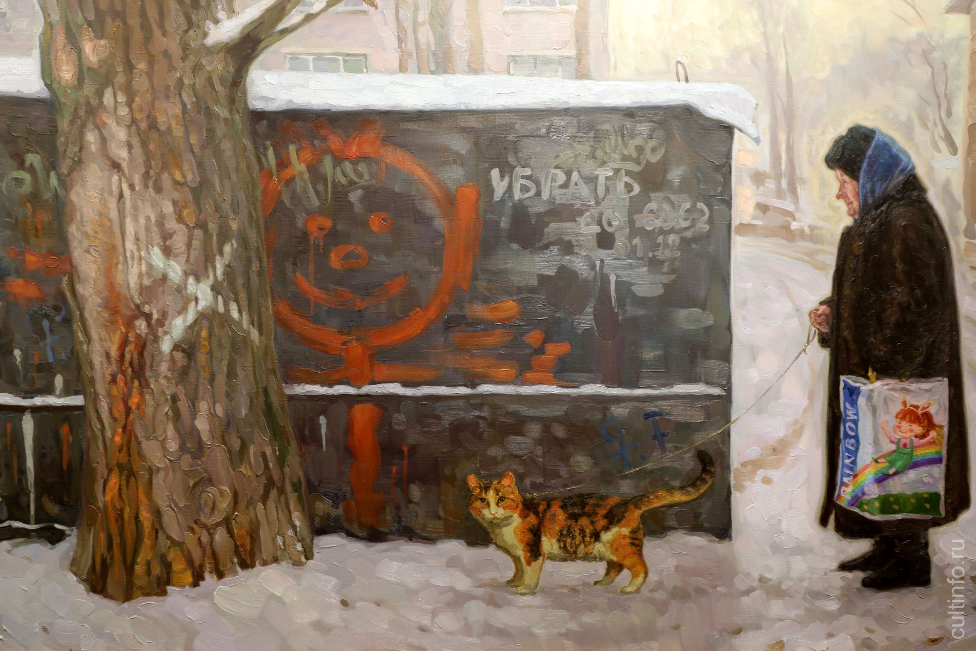 Сам художник считает, что лицо города – это его жители. Поэтому у каждой работы есть свой герой, и в каждой разворачивается своя история. Здесь нет случайных деталей. В картине «Встреча» 2012 года мастер изобразил социальную драму. На первый взгляд всё буднично: ржавый гараж, пожилая женщина с котом и дерево. Казалось бы, что их связывает?
