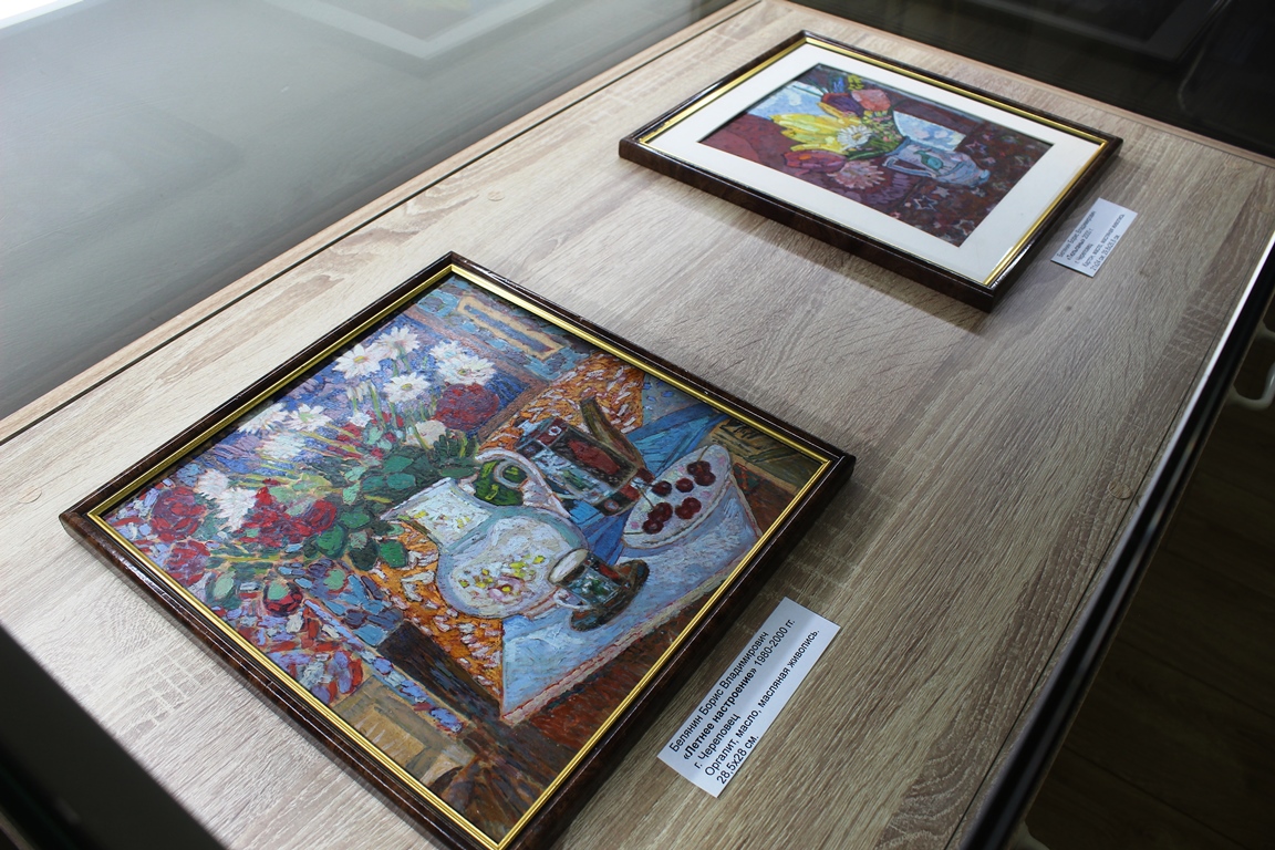 На выставке представлены работы из фондов Белозерского музея. Особую ценность экспозиции придают произведения, несколько лет назад переданные в музей вдовой художника Долорес Григорьевной.