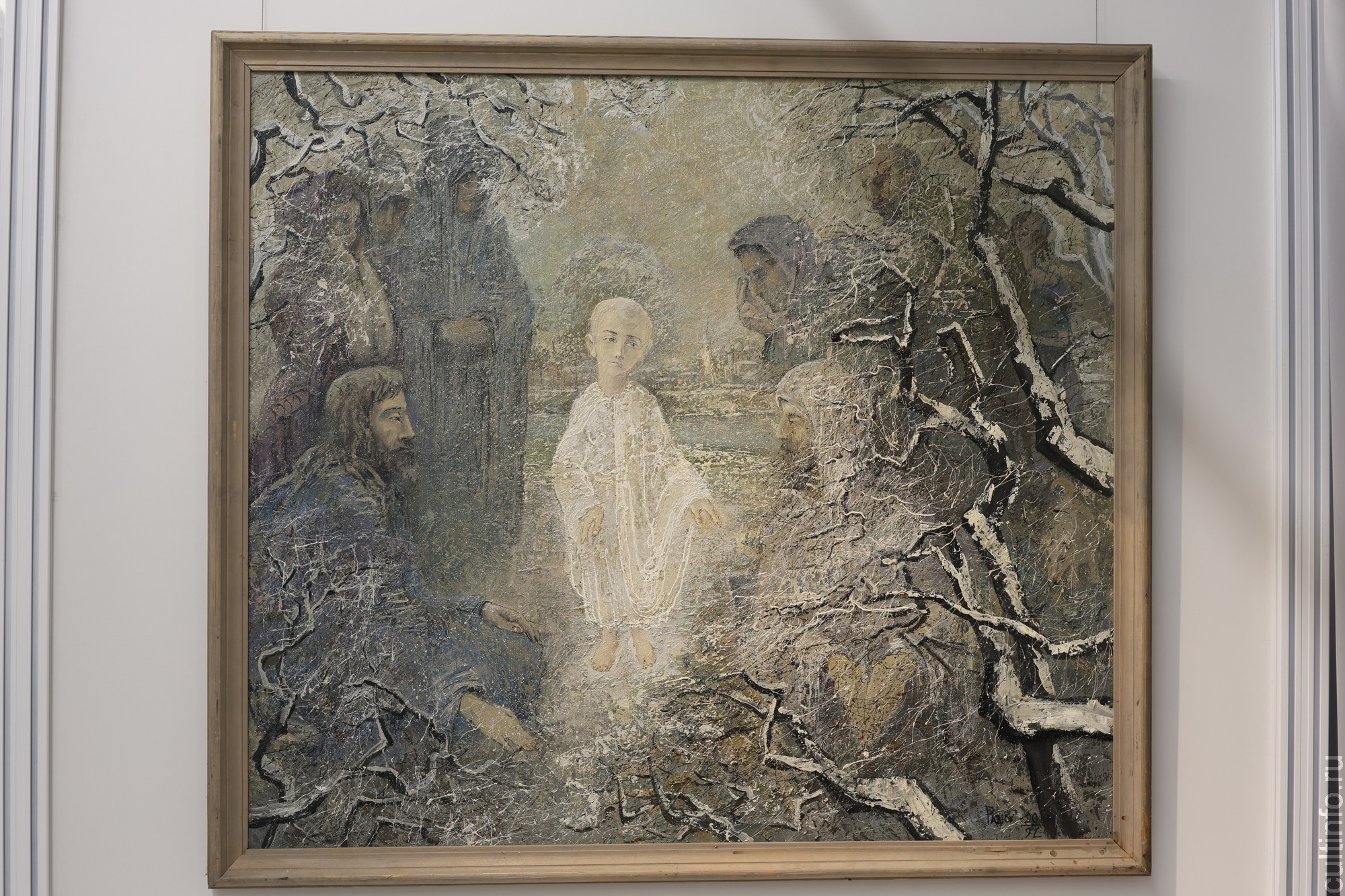 Центральная работа экспозиции – триптих «Явление святой Троицы народу». Его художник пишет уже более 30 лет, постоянно возвращаясь к произведению. Изначально, в 1991 году, будущий триптих назывался «Явление Христа народу» и был одной картиной. Иисус, по замыслу художника, изображался в образе младенца как символ возрождения веры, утраченной после Октябрьской революции. Со временем восприятие творчества, Бога и веры в целом изменились, поэтому изменилась и сама картина. Художник превратил ее в триптих и дал произведению другое название.
