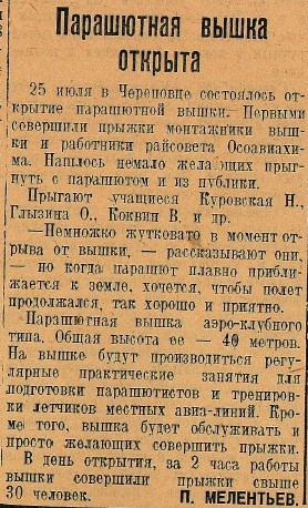 Открытие парашютной вышки в Череповце состоялось 25 июля 1937 года. Газета «Коммунист» так описывала события этого дня: «…Первыми совершили прыжки монтажники вышки и работники райсовета Осоавиахима. Нашлось немало желающих прыгнуть с парашютом и из публики. Прыгают учащиеся Куровская Н., Глызина О., Коквин В. и др.
