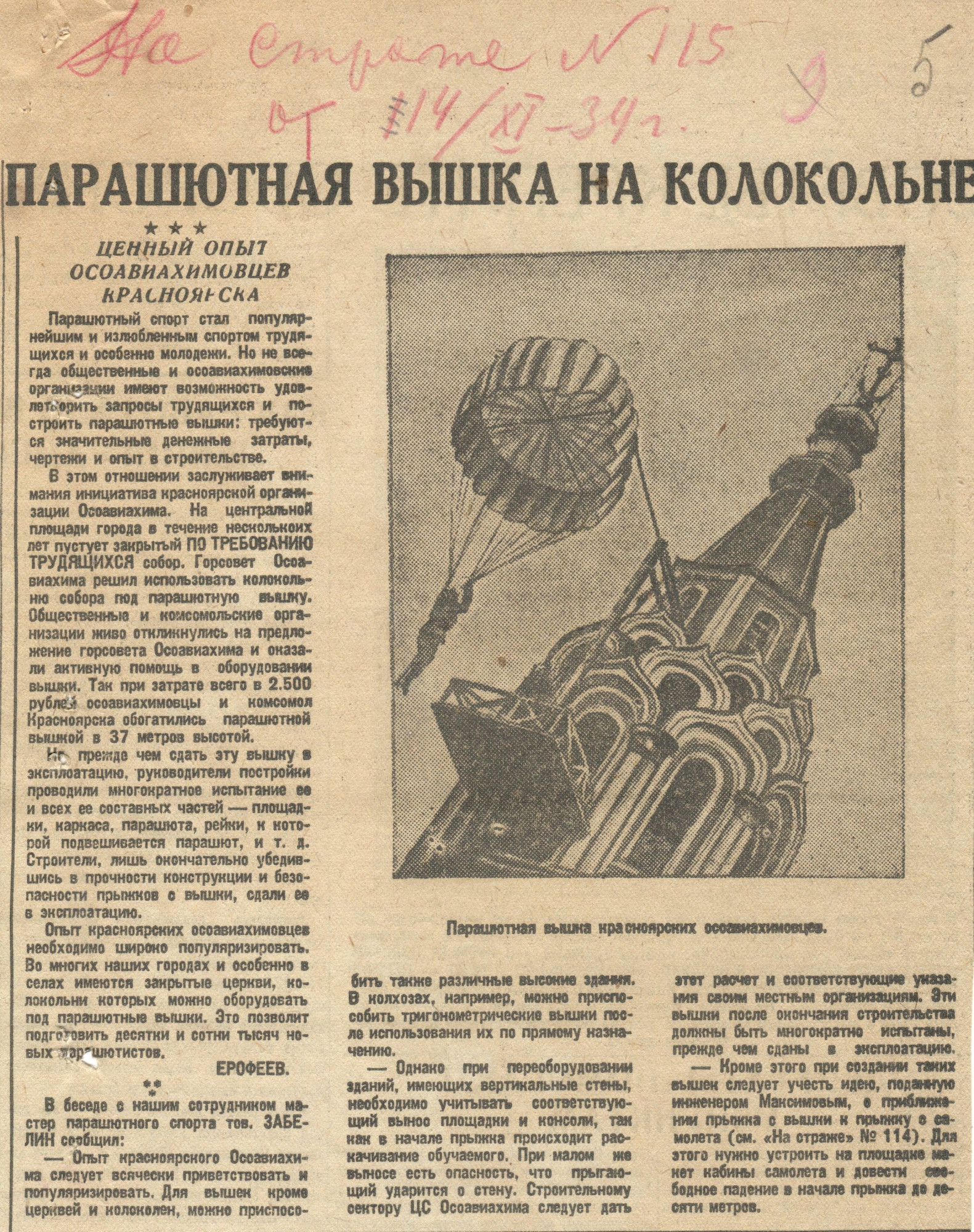 Эта сумма для сооружения вышки была ничтожно малой и уже в январе 1935 года райсовет Осоавиахима ходатайствовал перед горсоветом об использовании под парашютную вышку колокольни Благовещенского собора (это была распространенная практика в нашей стране, под вышки приспосабливались любые подходящие высотные конструкции). Разработка чертежа и проекта переустройства колокольни проходила под руководством архитектора Генриха Шапиро и городского инженера Григория Тихомирова [7]. Высота колокольни была всего 20 м, предполагалось увеличить её за счет надстройки пятнадцатиметровой башни. Однако президиум горсовета признал выбор места неудачным, так как сооружение вышки на колокольне вызвало бы значительные расходы. К тому же площадь, где располагался собор с колокольней, была недостаточно большой для нормальной работы парашютной вышки, а её расширение нарушило бы транспортное и пешеходное движение [8].