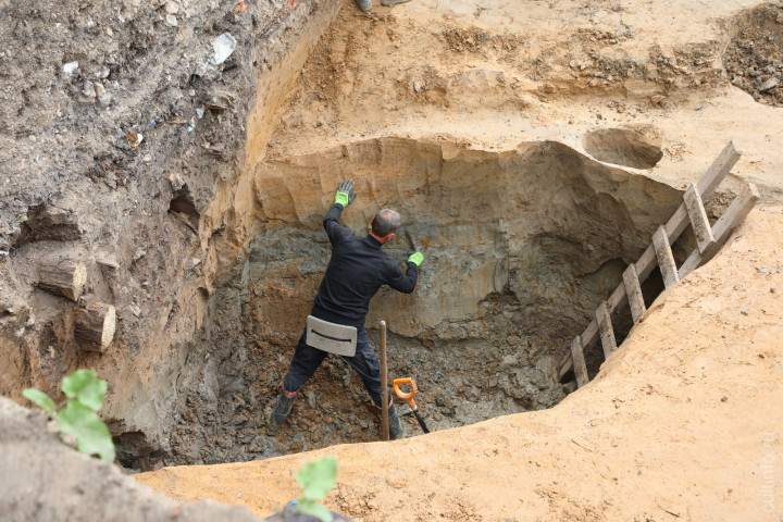 Остатки еще одной конструкции, вероятно, XIX века находились на дне раскопа – полые бревна с заглушками. Предположительно это деревянные трубы для слива воды. Их археологи тщательно изучили, зафиксировали и извлекли.