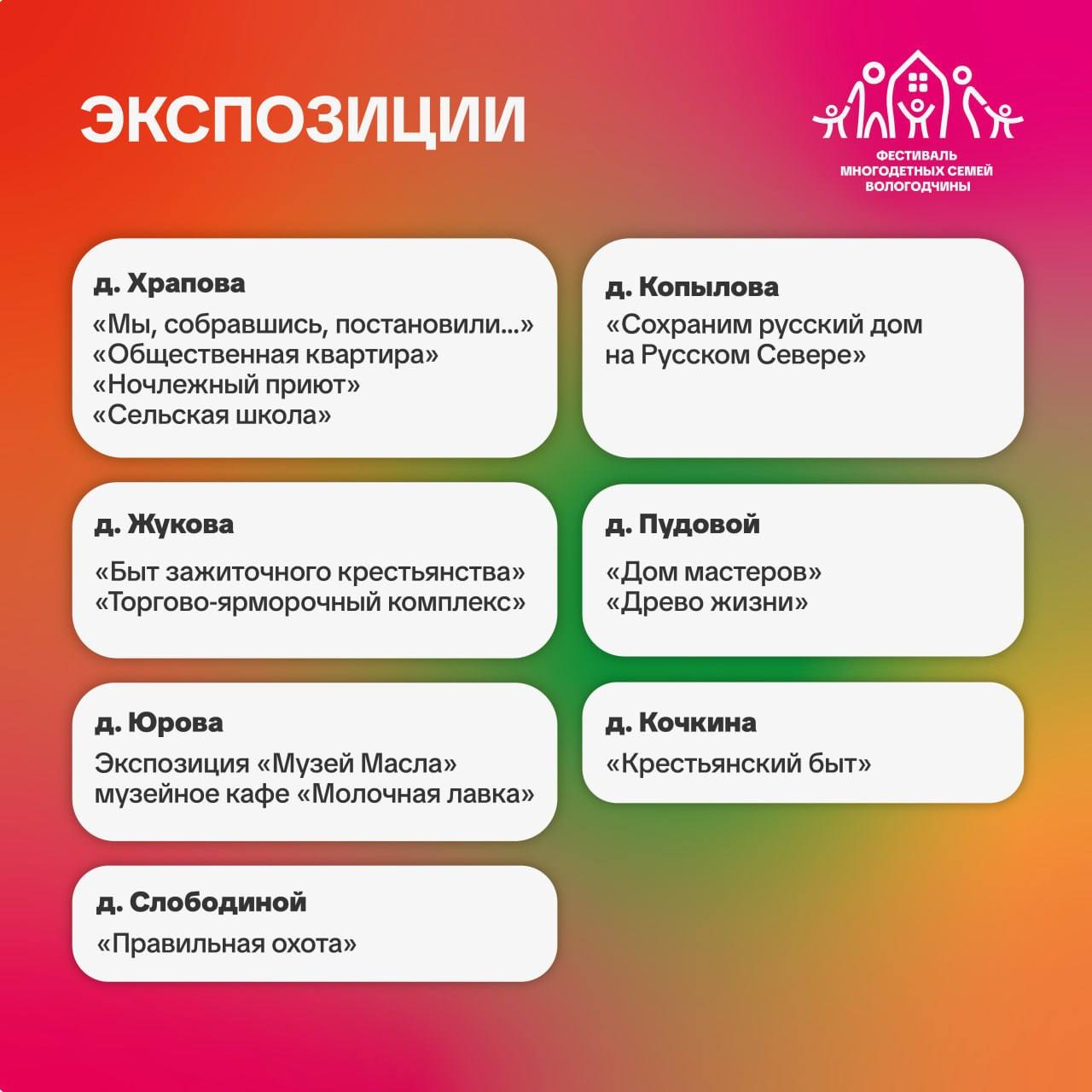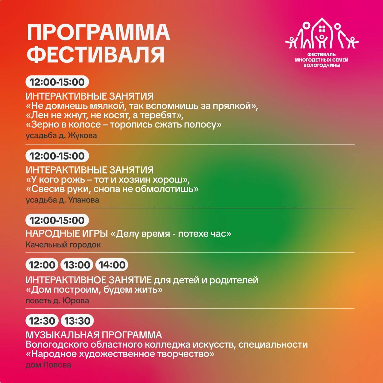 «Проведем фестиваль в знак благодарности семьям, которые своим трудом и заботой создают прочный фундамент будущего региона. Готовим насыщенную праздничную программу в духе русской деревни, народных традиций, урожайного сезона. Приглашаем всех жителей и гостей Вологодчины от мала до велика. Для дошкольников, детей из многодетных семей, инвалидов, военнослужащих срочной службы участие бесплатное», – рассказал Георгий Филимонов.