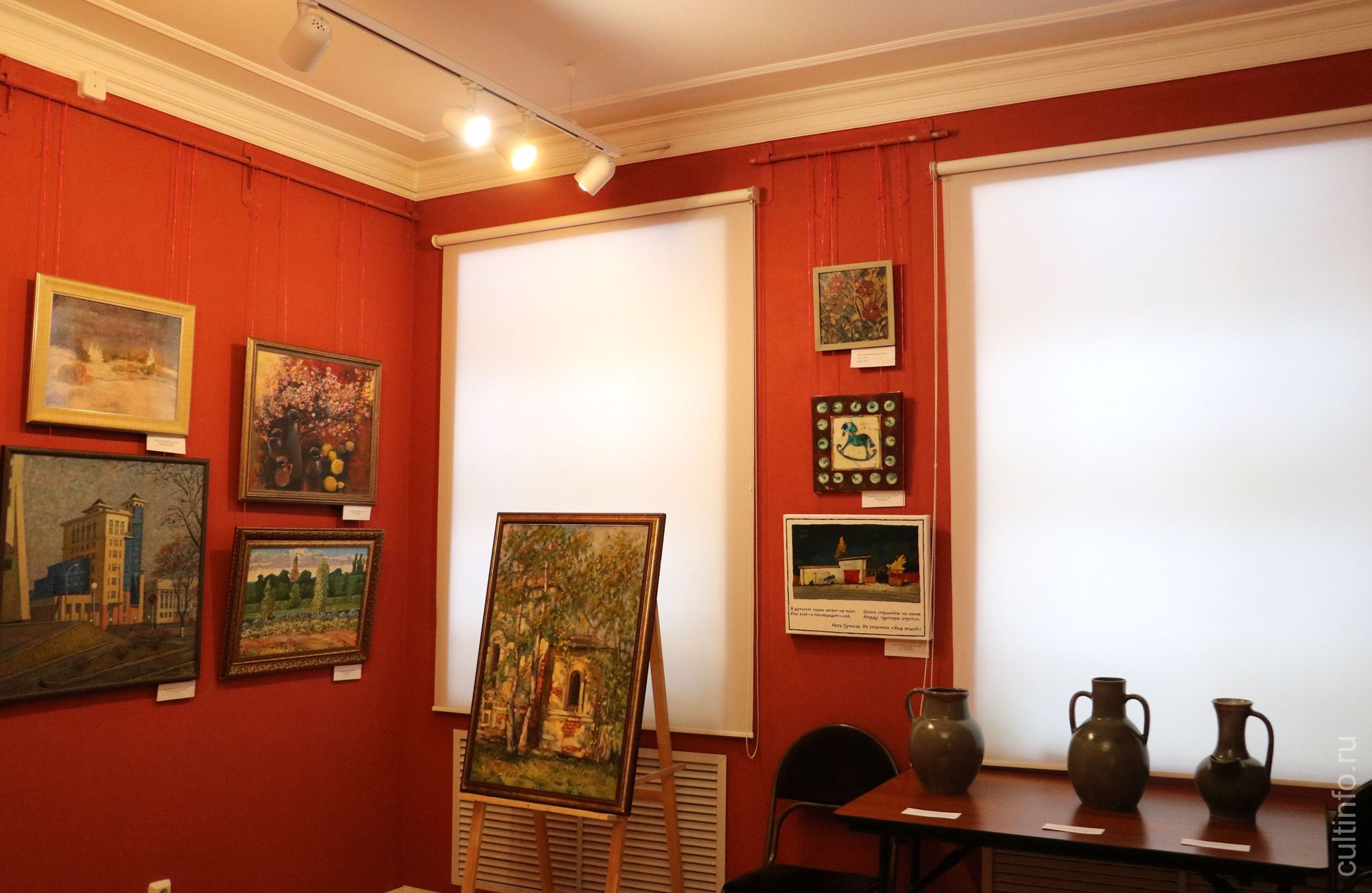 Здесь можно найти и городские пейзажи автора мозаичных панно Бронислава Кураго, и натюрморт в технике монотипии Николая Мишусты, «луговые цветики» Марии Ведясовой, гравюры Владимира Лупандина, батик Полины Рыбаковой, а также керамические изделия Владимира Холщагина и расписанные Ириной Ганичевой пасхальные яйца.