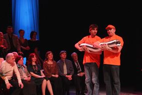 Первая часть праздника – озорной капустник, подготовленный актерами Театра для детей и молодежи. Хотя с самого начала тон мероприятию был задан «серьезный» – все «строго по регламенту»: суровый голос Бориса Александровича часто звучал «за кадром», пресекая любые попытки вклиниться в запланированный ход действа.