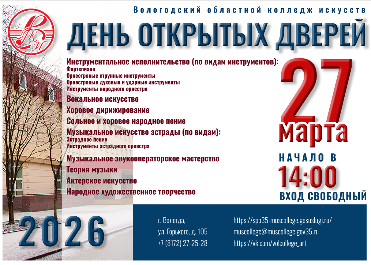 Программу Дня открытых дверей в Вологодском колледже искусств 27 марта в 14:00 откроет концерт с участием студентов. Основные мероприятия пройдут по адресу: Вологда, ул. Горького, 105.