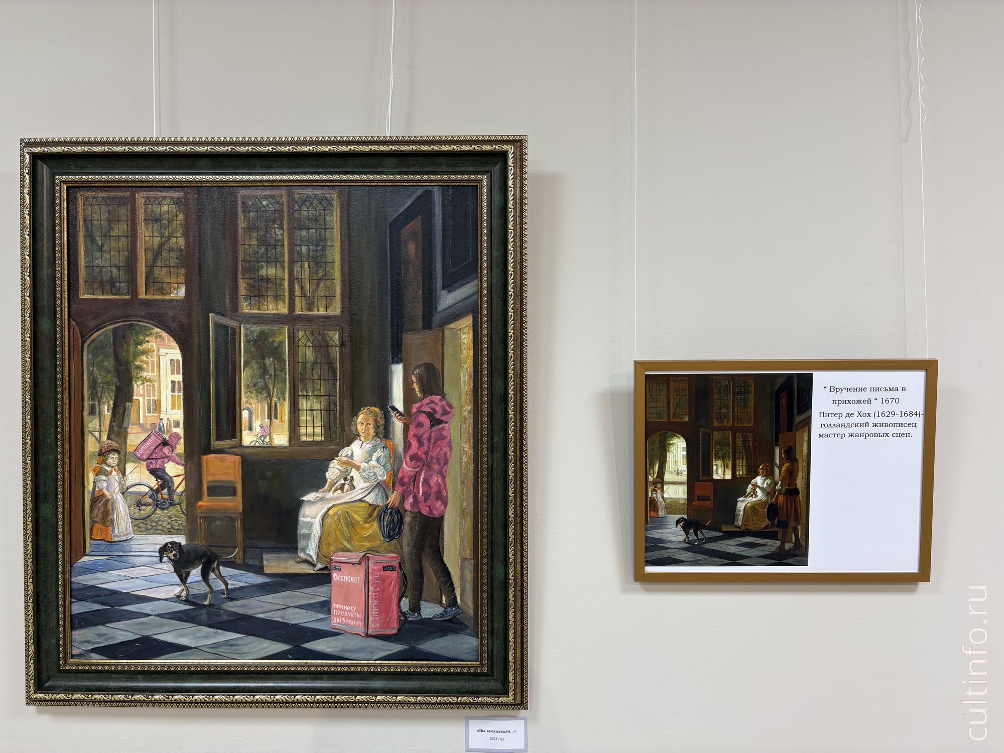 В основе экспозиции – ироничное и философское переосмысление известных сюжетов. Например, в интерпретации картины Пимена Никитича Орлова «Сцена из римского карнавала» мы видим героев, делающих фото современным телефоном на селфи-палке. На полотне «Модная покупка» мы видим велотренажер, который органично вписался в картину итальянского художника Франческо Беда «В ателье художника». А сюжет «Вручения письма» Питера де Хоха получил неожиданное продолжение в виде службы доставки «Самокат».