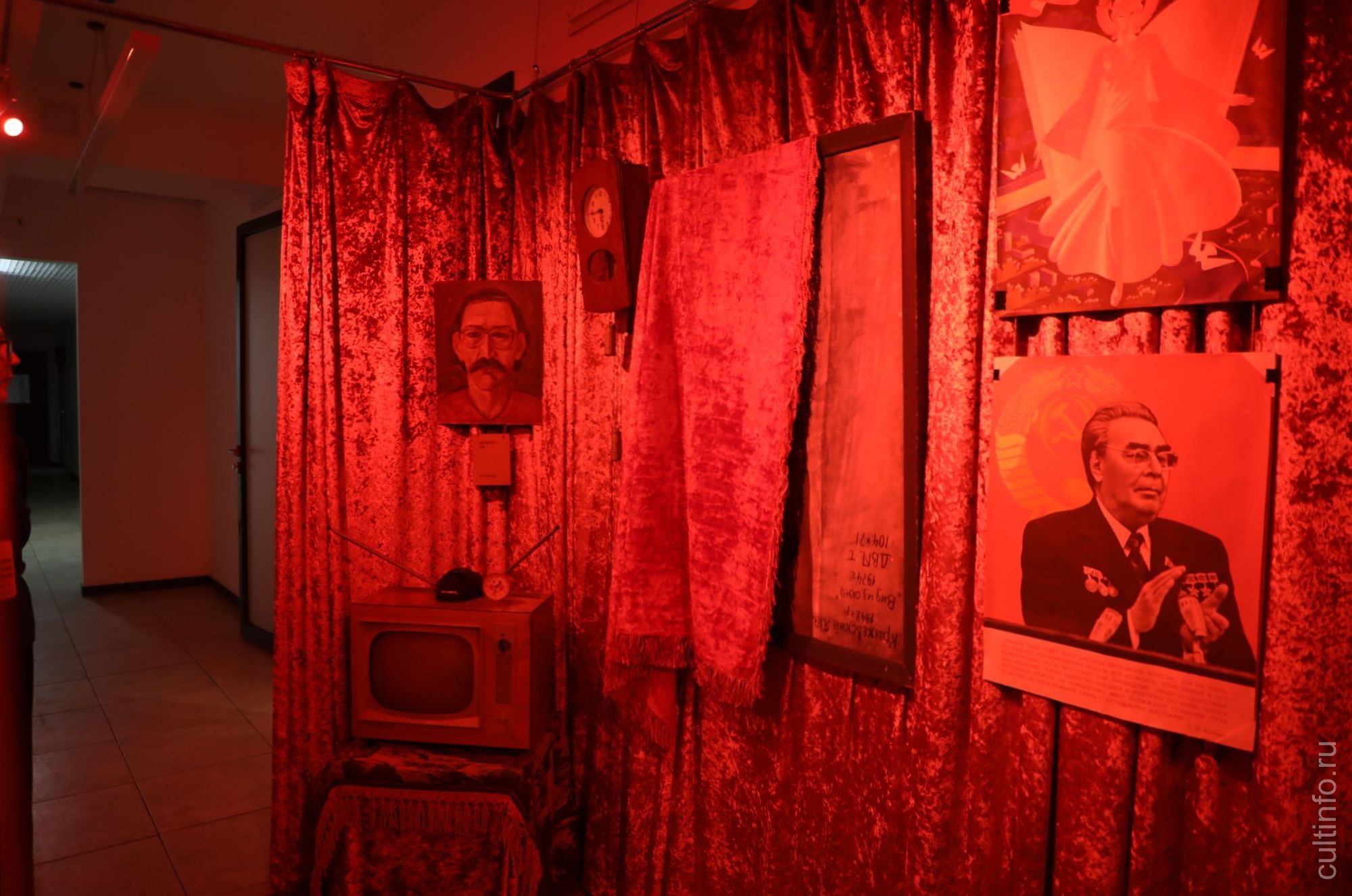 И проходя по выставке, посетитель тоже совершает некое путешествие между разными реальностями. Так, инсталляция на входе показывает контраст между внешним миром с его официальной идеологией и внутренней вселенной Крыжевского. В импровизированной комнате собраны знамёна, грамоты и предметы массового быта. За советским антуражем организаторы выставки обратились в Музей вологодских сталкеров. «Оформляли пространство в красном. Но подобрать предметы этого цвета было не так-то просто. Потому что хоть красный и соответствовал советскому стилю, в быту он использовался не так часто», – отметил директор музея Олег Шаров.