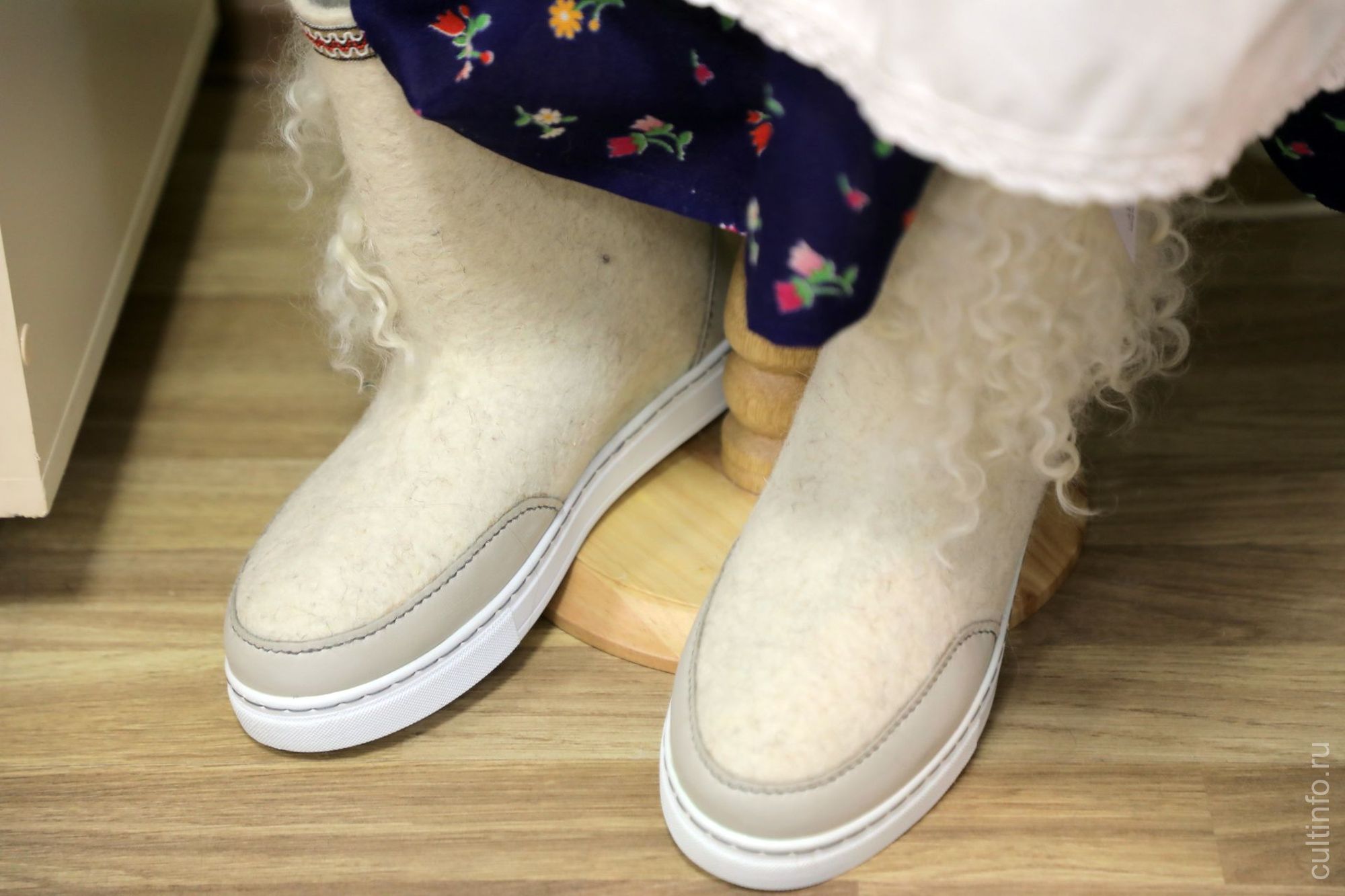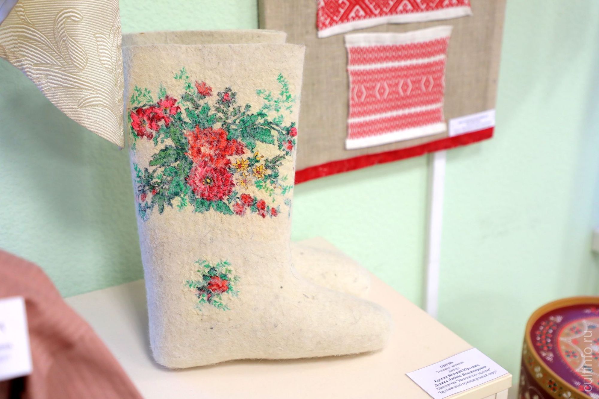 Славилась череповецкая земля и своими катавалами. На выставке можно увидеть валяную обувь мастерской-катавальни «Мяксинские задилья» села Мякса. Ее основатель Валерий Ерохин – мастер-катавал в четвертом поколении. Вместе с супругой Любовью он продолжает дело предков. В производстве используется старинная технология без химии: натуральная некрашеная шерсть, горячая вода и гидравлическая сила. Шерсть закупается у местных производителей и в Татарстане. Прочесывают ее на специальной чесальной машинке. Укатанная до нужного размера шерсть раскладывается на выкройку. После этого будущие валенки садят на форму и отправляют на сушку.