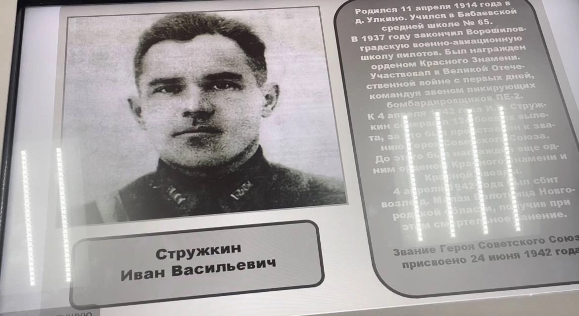 В Бабаевском краеведческом музее им. М.В. Горбуновой в обновленной экспозиции по региональной программе «Музеи Вологодчины: Наша победа. Связь поколений» отражена преемственность поколений: от прадедов к нынешнему поколению. В Бабаевском округе девять Героев Советского Союза, четверо из них были летчиками. На выставке представлена форма летчика времен Великой Отечественной войны: гимнастерка и галифе синего цвета, летный шлем, очки, ремень и сапоги. На интерактивной панели посетители могут получить информацию о событиях Великой Отечественной войны.