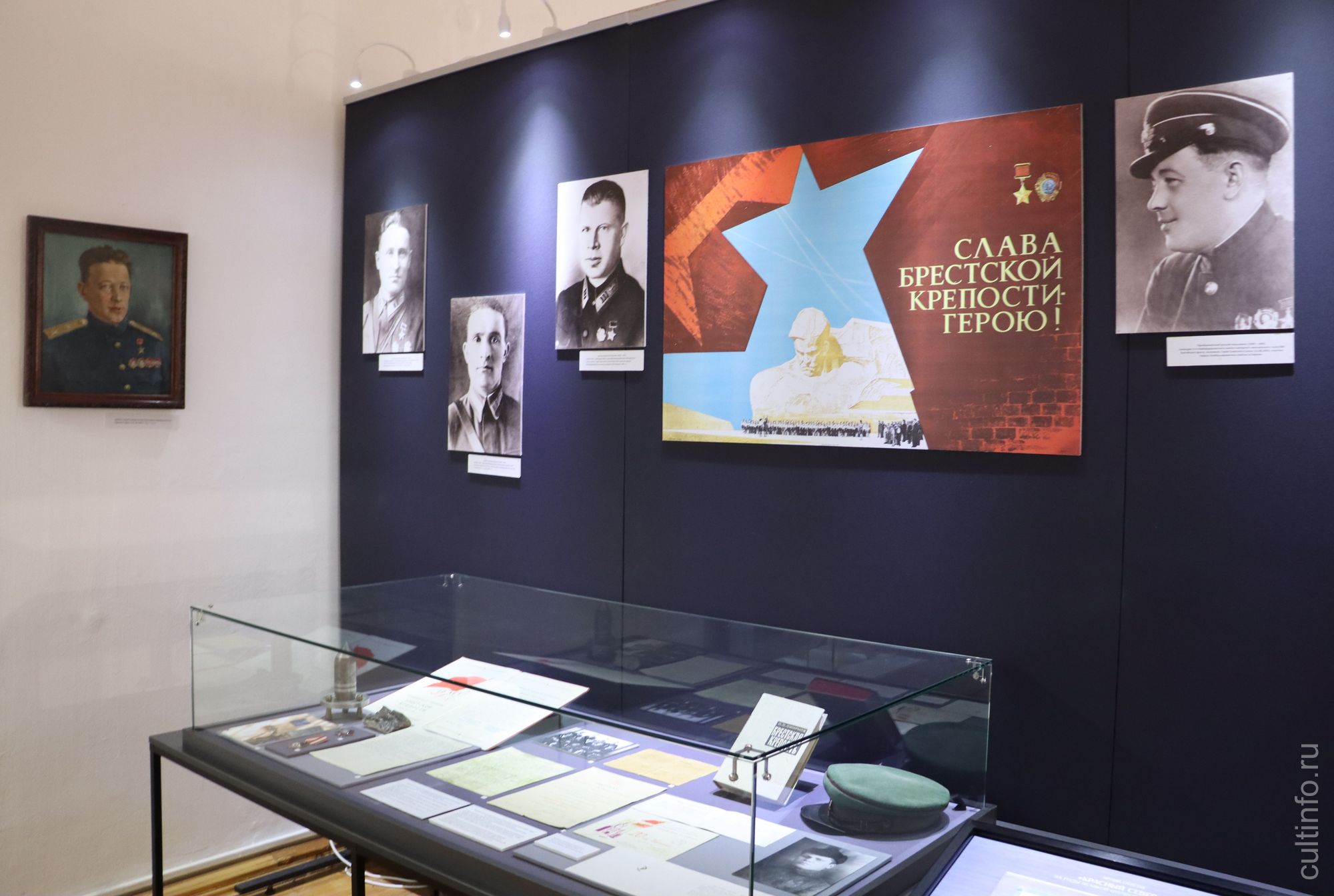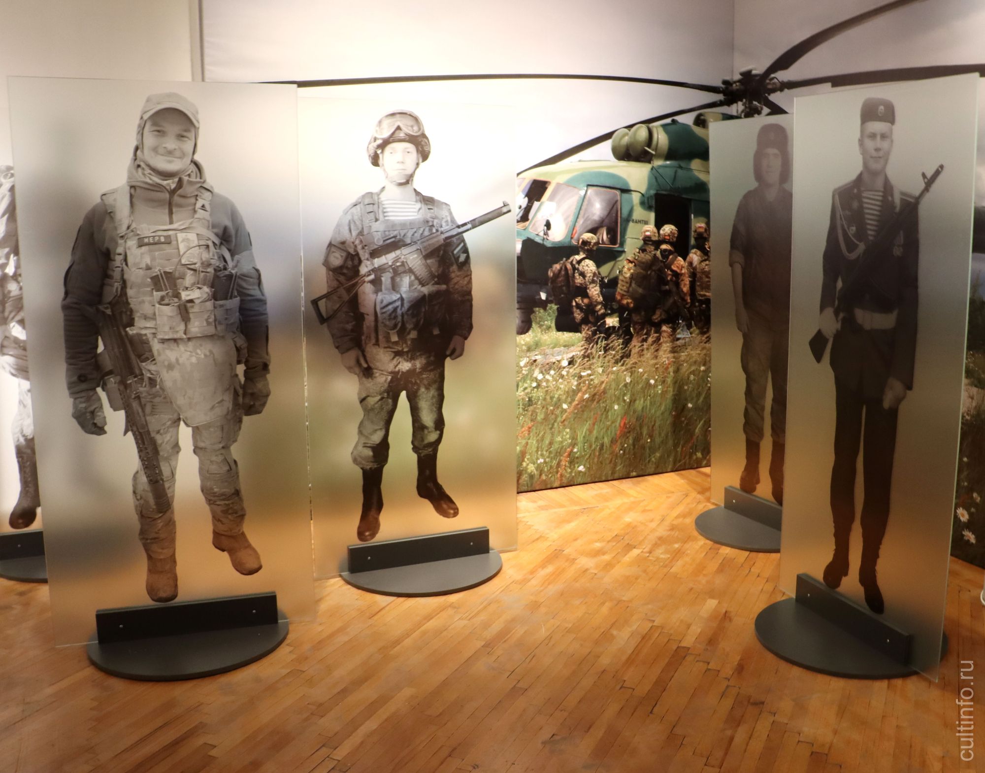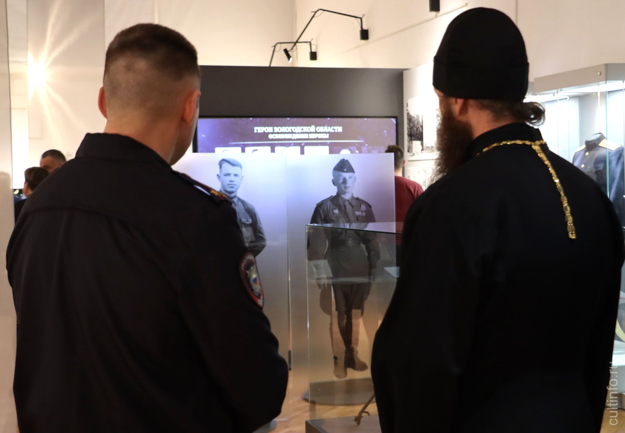 Впечатляют и другие дизайнерские решения – подвесные из ткани и напольные конструкции из стекла с фотографиями воинов в полный рост. Среди экспонатов выставки можно увидеть парадный мундир дважды Героя Советского Союза маршала Ивана Конева, китель Героя Советского Союза, летчика-истребителя Игоря Каберова, фотографии и анкету ветерана Великой Отечественной войны, одного из руководителей партизанского движения Белорусской ССР Александра Морщинина, фотографии Героя РФ летчика Андрея Завитухина, а также снимки из архива полковника, участника военных действий в Афганистане Сергея Пастухова, который стал почетным гостем на открытии выставки.
