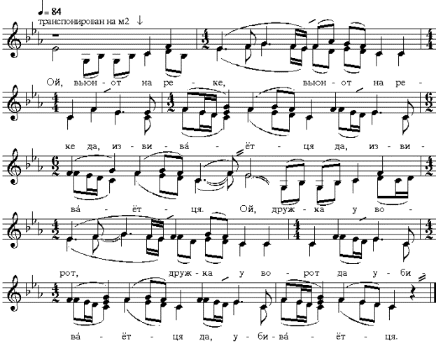Пример 2а: свадебная песня “Ой, вьюн-от на реке” (д. Чернево, 02-08, 1999 г.)