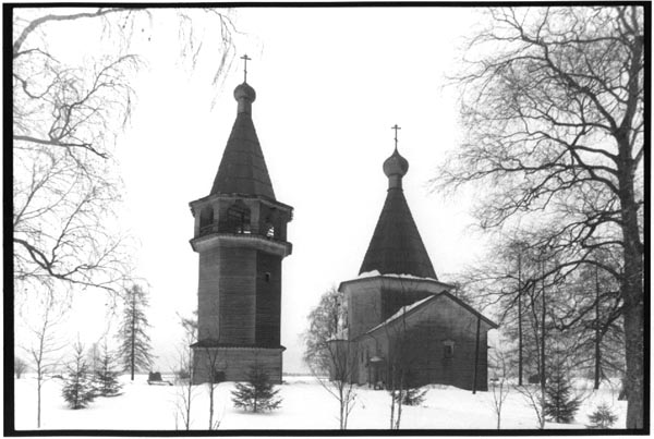Наиболее примечательное деревянное сооружение, что мне довелось увидеть во время февральской поездки (1998 г.) находится в с. Лядины, в 80 км от Каргополя (6-1). Этот замечательный ансамбль состоит из 3 памятников: летняя высокая шатровая Покровская церковь (1761 г.), зимняя Богоявленская церковь (1793 г.) (ил. 10) с пышными куполами и огромная колокольня (6-2).
