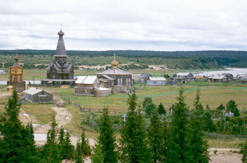 From left: bell-tower, church of the Dormition, church of Saint Afanasii. Background: left bank of the Varzuga river