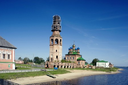 Слева-направо: Строгановские палаты; жилой дом городской администрации (1940); правление Шувалова; соборная колокольня и торговые ряды; Преображенский собор, руины часовни Спаса Убруса; усадьба Голицыных; дом Мальцева. Вид с р. Камы