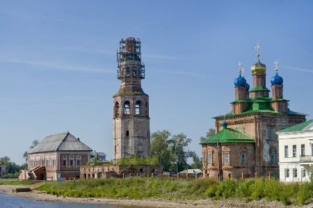 Слева-направо: палаты Строгановых, торшлвые ряды и соборная колокольня, Преображенский собор, усадьба Голицина. Вид с р. Камы