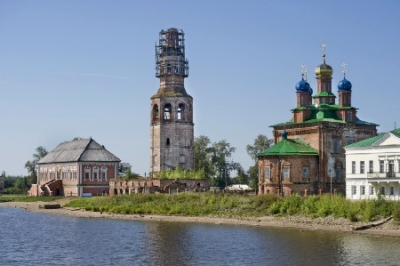 Слева-направо: палаты Строгановых, торшлвые ряды и соборная колокольня, Преображенский собор, усадьба Голицина. Вид с р. Камы