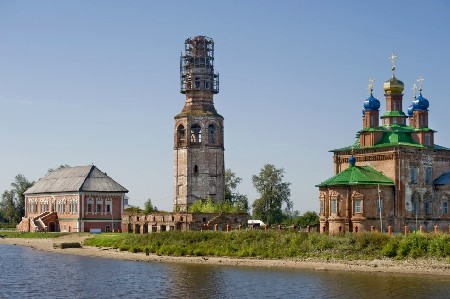 Слева-направо: палаты Строгановых, торшлвые ряды и соборная колокольня, Преображенский собор. Вид с р. Камы