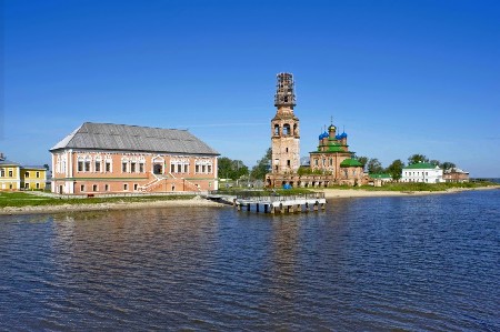 Слева-направо: контора сользавода; Строгановские палаты; соборная колокольня и торговые ряды; Преображенский собор, руины часовни Спаса Убруса; усадьба Голицыных; дом Мальцева. Вид с р. Камы