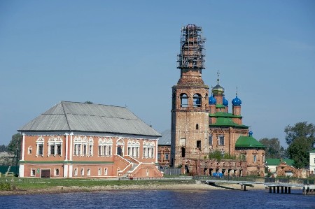 Слева-направо: Строгановские палаты; соборная колокольня и торговые ряды; Преображенский собор, руины часовни Спаса Убруса. Вид с р. Камы