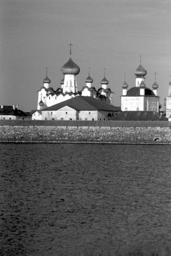 Left: Transfiguartion cathedral; right: church of Saint Nicholas. Foreground center: Trinity-Saints Zosima and Savvatii cathedral