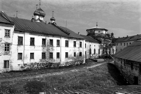 Слева-направо: Святительский корпус, кельи (за ними — купола Спасо-Преображенского собора), ц. Филиппа Митрополита, Архангельская башня, Прачечный корпус, мельница