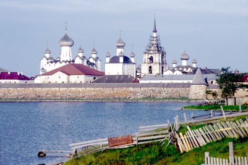 From left: Transfiguration cathedral; Trinity cathedral; Prosphora chambers (in front) and Church of Saint Nicholas; Povarennii chambers (in front), bell tower, Dormition church; Povarennaia tower