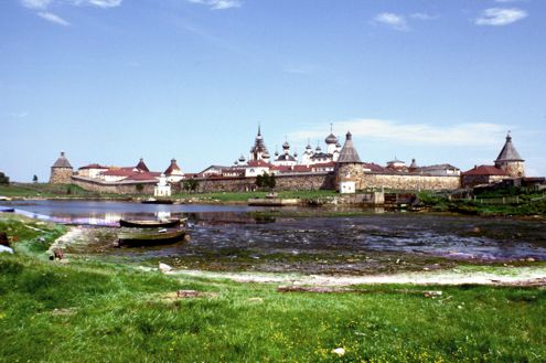 From left: Korozhnaia tower, Icon chambers, Deputy Superior's building, Nikolskaia tower (far), Saint Alexander chapel and Dormition tower, Dormition church, Gate church of the Annunciation and bell-tower, Church of Saint Nicholas, Transfiguration cathedral, Saint Peter chapel and Priadilnaia tower, monastery hydroelectric station and Belaia tower with Sushilo