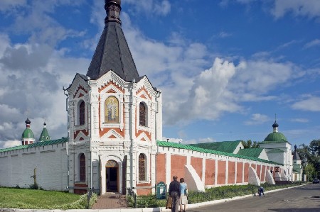West wall. Right: gate church of Saint Kirill Belozersk; chapel of the Blessed Kseniia of Petersburg