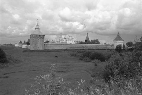 From left to right: South-West wall (Mill and Water Towers), South Tower, Belltower and the Gate Church of Ascension, Refectory Church of the Presentation and behind it — Cathedral bell tower, Cathedral of the Savior (center), Church of the Dormition