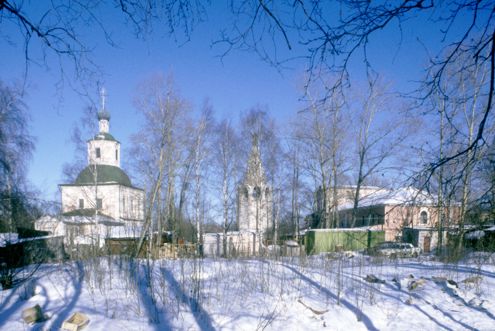 Left: church of Vladimir icon of the Mother of God; center: bell tower; right: ’warm’ church of Vladimir Icon of the Mother of God (Archangel Gabriel)