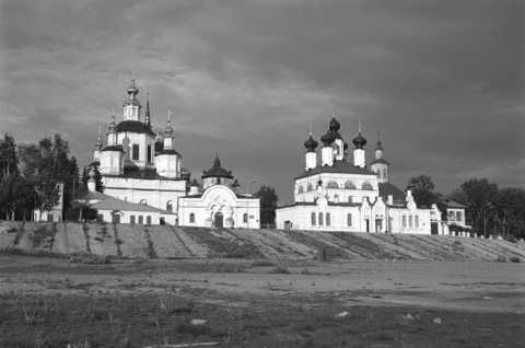 Left:Cathedral of the Dormition, bell tower. center: Cathedral of Saint John of Ustiug, right: Cathedral of Saint Prokopii of Ustiug