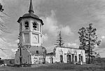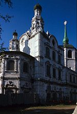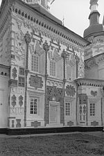 Самая замечательная особенность Преображенской церкви - это ее возвышающийся западный портал (фото 18) с уникальной замысловатой конструкцией. Здесь есть прямое сходство с такими енисейскими памятниками, как Троицкая церковь (фото 19), чье строительство было начало в 1772, экстерьер был завершен в 1776, интерьер - в 80-е годы 18 века.45 Содержа элементы церковного зодчества Вологды и Урала, Троицкая церковь включает и характерные особенности, присущие Сибири - как восточной, так и западной. Хотя эта прекрасная церковь было значительно разрушена в советский период, а то что осталось используется под склад, сохранившаяся структура имеет отчетливые оконные бордюры с треугольными фронтонами, которые, возможно, несут в себе азиатские мотивы. |