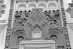 Один из позднейших примеров восточных мотивов в орнаменте фасадов храмов 18 века относится к Покровской церкви в Красноярске (илл. 10, илл. 11, фото 20), старейшему из сохранившихся памятнику в городе. Строительство церкви было начато в 1785, два боковых алтаря завершены в 1790, однако главный алтарь был освящен лишь в 1795.48 Главная структура церкви кульминирует в вытянутом барабане и куполе. Но внешний фасад, покрашенный в красный цвет с белыми деталями, украшен внизу значительным по размеру орнаментом, который, опять же ясно указывает на восточные корни и включает формы и ступы, и лотоса.49 |